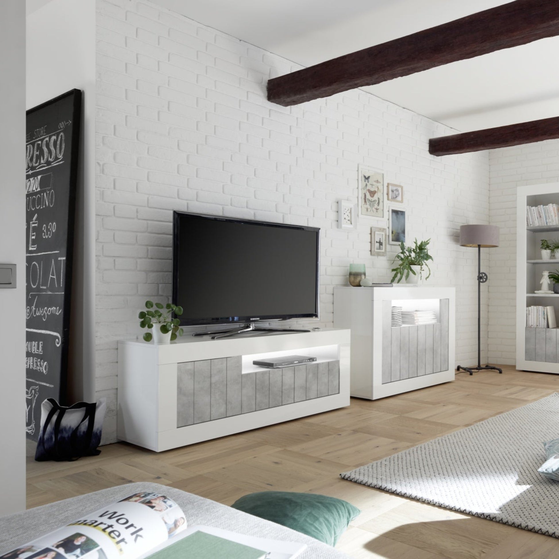The Como TV Stand in Gloss White and Grey combines modern style with practical storage.