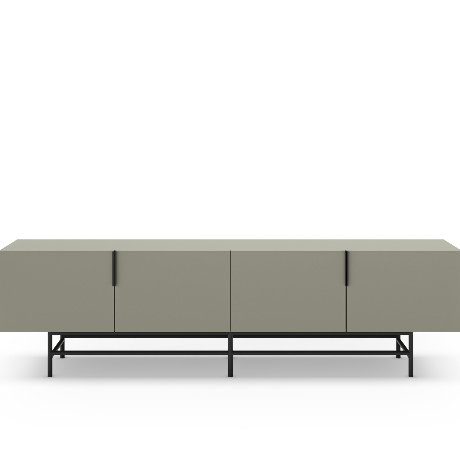 The Eldia TV Stand combines modern design with practical storage, featuring a stylish light green finish and a sleek black metal base.