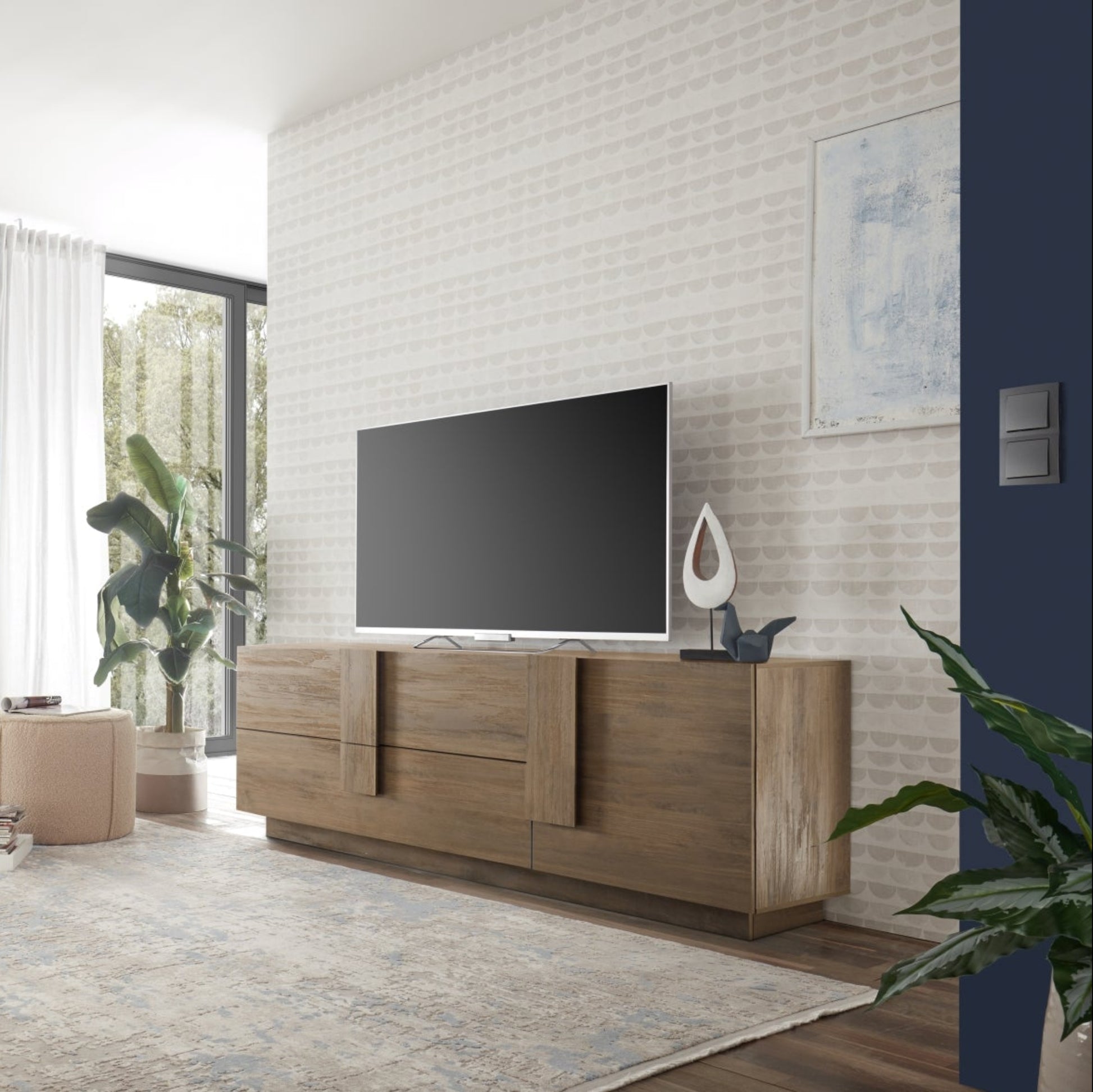 Featuring two drawers with unique design and smooth metal runners, plus a right-side door with an internal shelf, it offers versatile storage for your living space. Perfect as a sleek low sideboard or a sturdy TV stand supporting up to 30kg, Jesolo enhances any room with its contemporary appeal and practical organization.