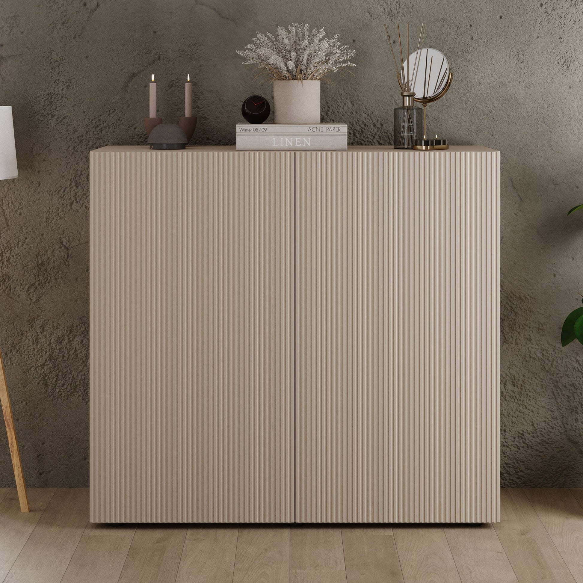 Its distinctive fluted door design adds a refined touch, making it a perfect blend of function and style for living or dining rooms. Measuring 120 cm wide, 42 cm deep, and 113 cm tall, it supports up to 30 kg on top and 10 kg per shelf.