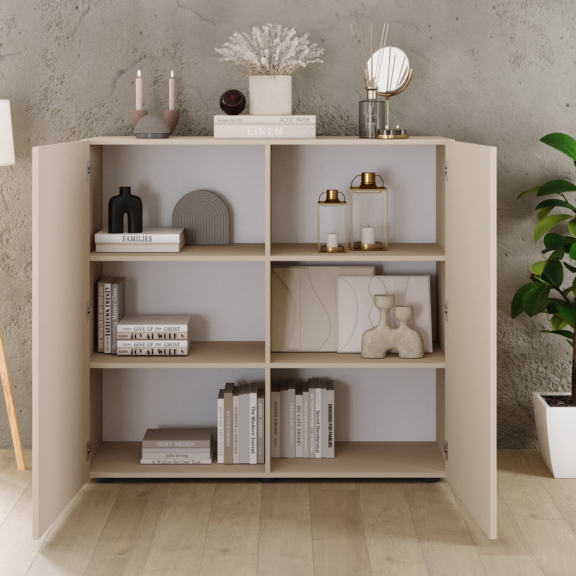 The Raveena two-door high sideboard in a cashmere finish offers ample storage with two doors—one opening on the left and one on the right—revealing four wooden shelves inside.