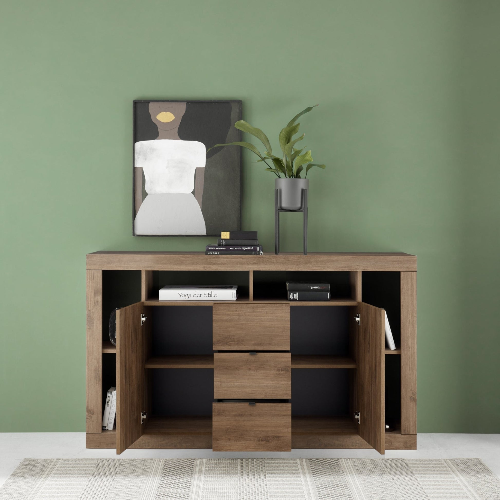 The Rolo Sideboard in a dark Mercure Oak finish combines style and practicality with two doors enclosing shelves for organized storage and three central drawers featuring smooth metal runners and contrasting handles for easy access.