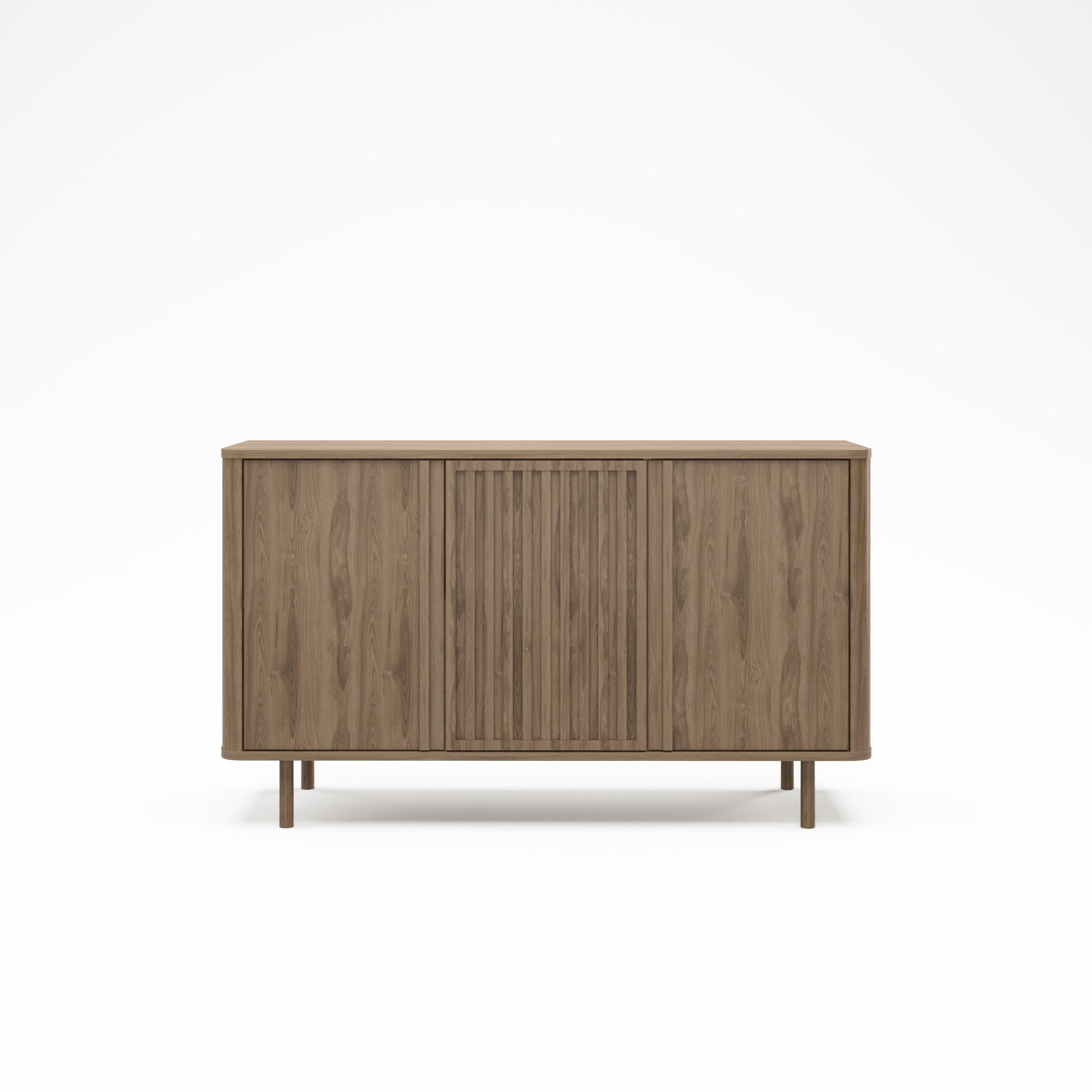 The Seville Three Door Sideboard features a durable oak-finished laminate surface and a distinctive fluted design on the central door, adding texture and style to your space.