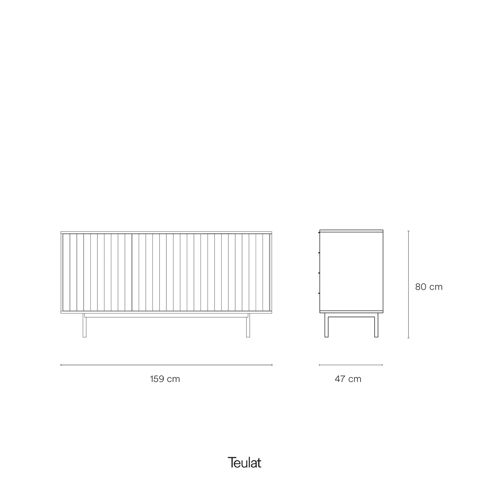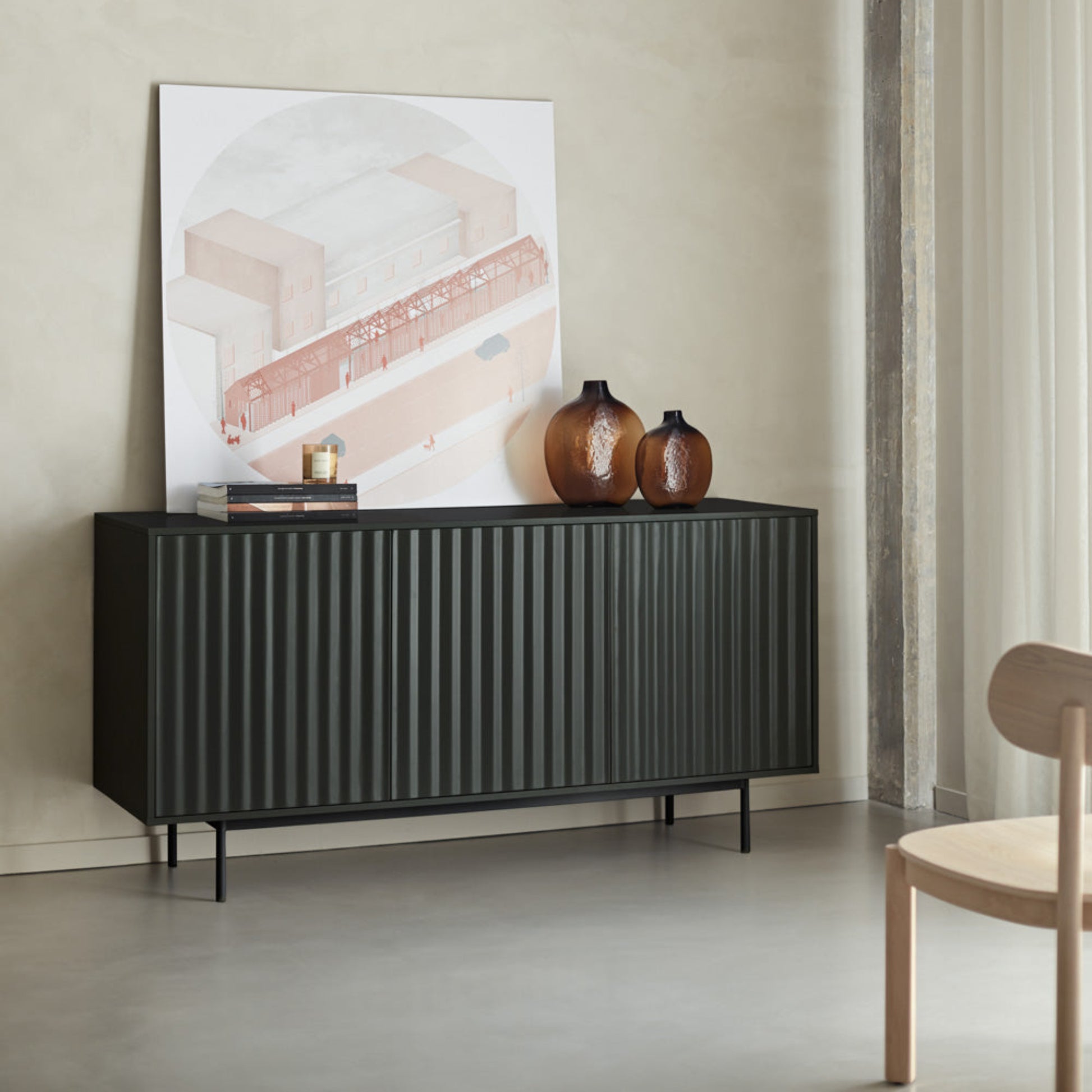 This statement piece offers intelligent storage with three push-release doors revealing four shelves and three soft-close drawers, perfect for organizing your treasured possessions with style. The pristine matt black finish and coordinating powder-coated metal legs exude contemporary elegance while complementing any modern interior. Meticulously designed by Teulat in Spain, this sophisticated 159.2cm wide sideboard combines premium lacquered MDF construction with exceptional craftsmanship. Delivered by professional furniture carriers and ready for simple self-assembly to transform your living space.