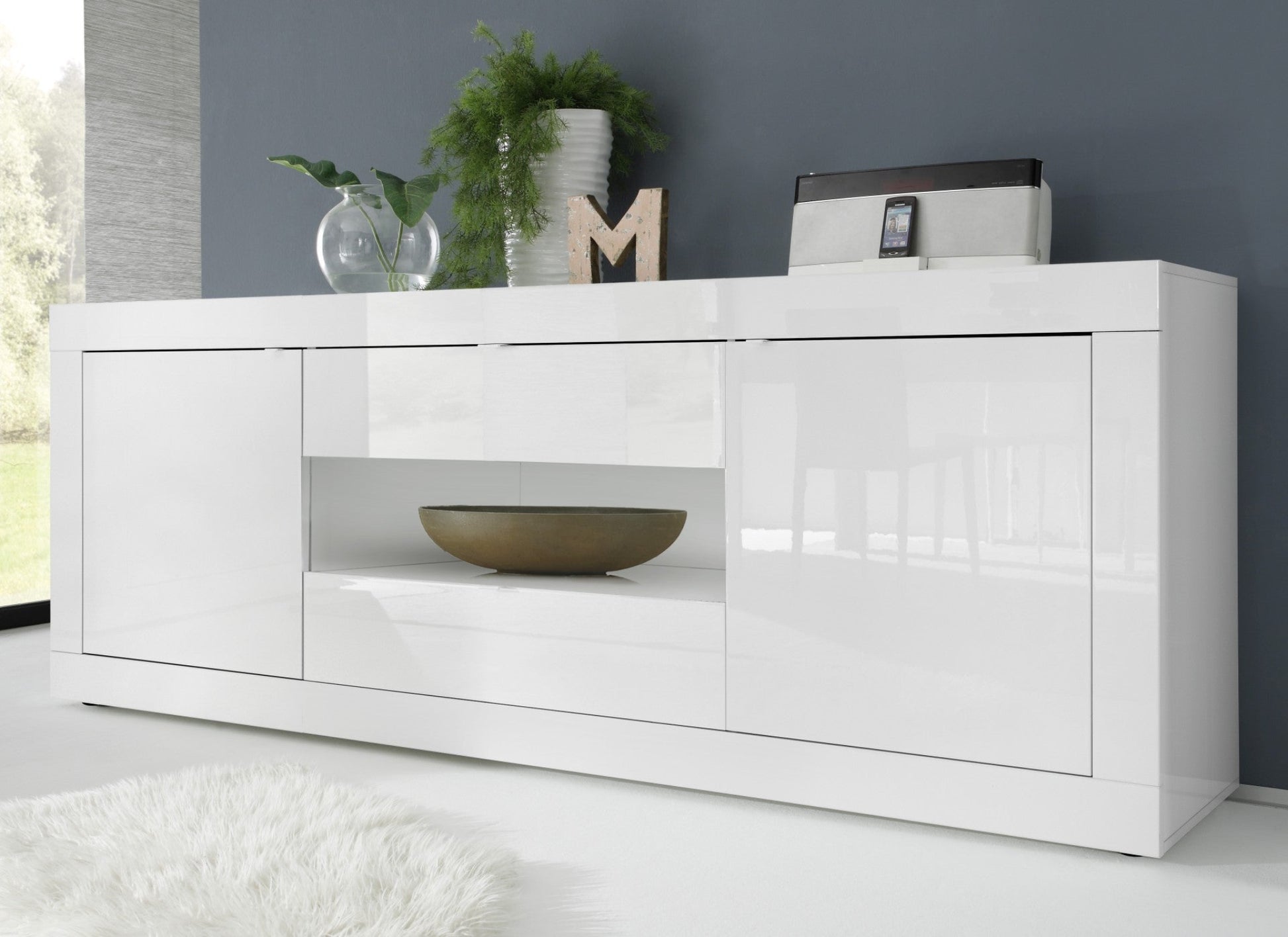 The Urbino Sideboard combines sleek lacquered gloss white surfaces with subtle white metal handles for a modern, elegant look.