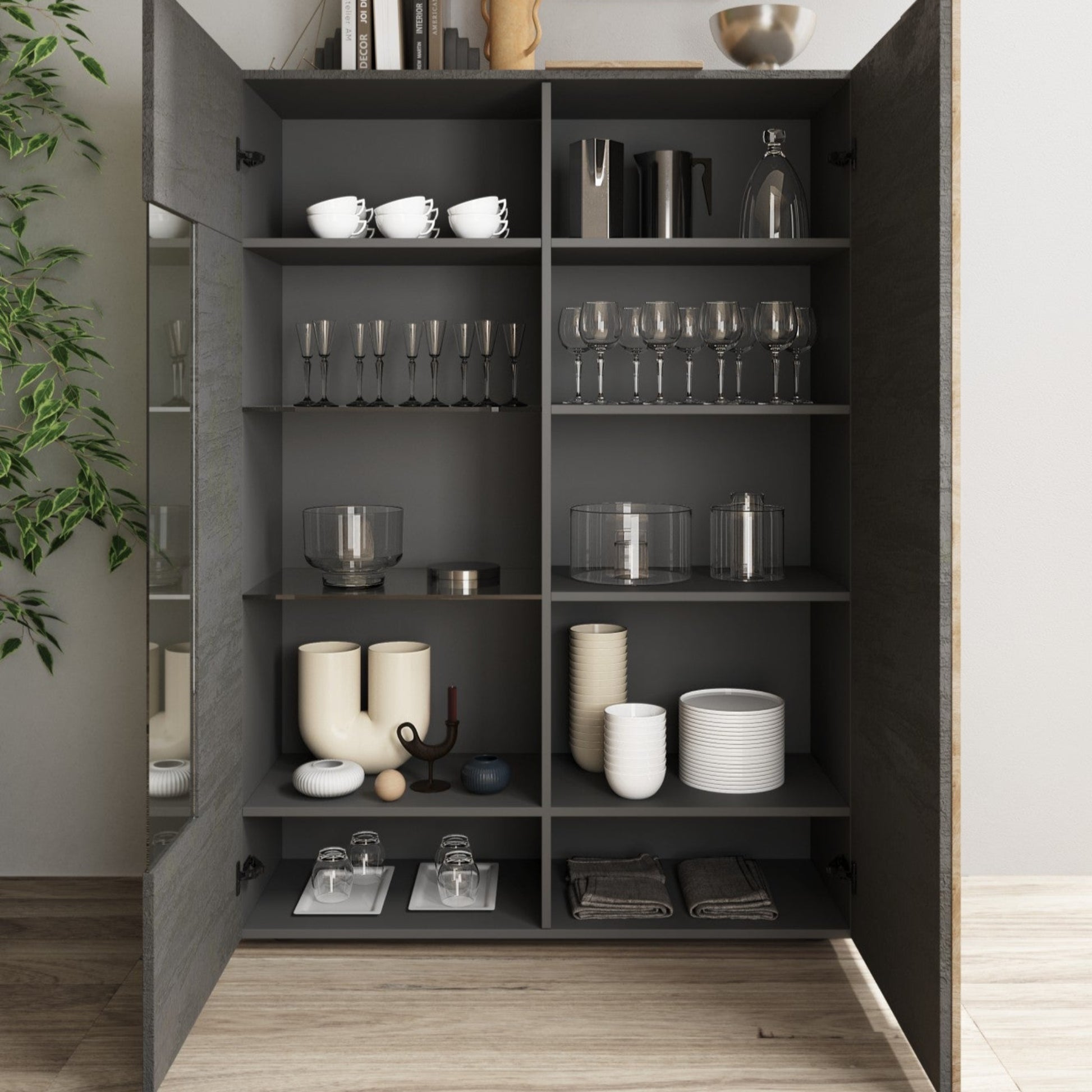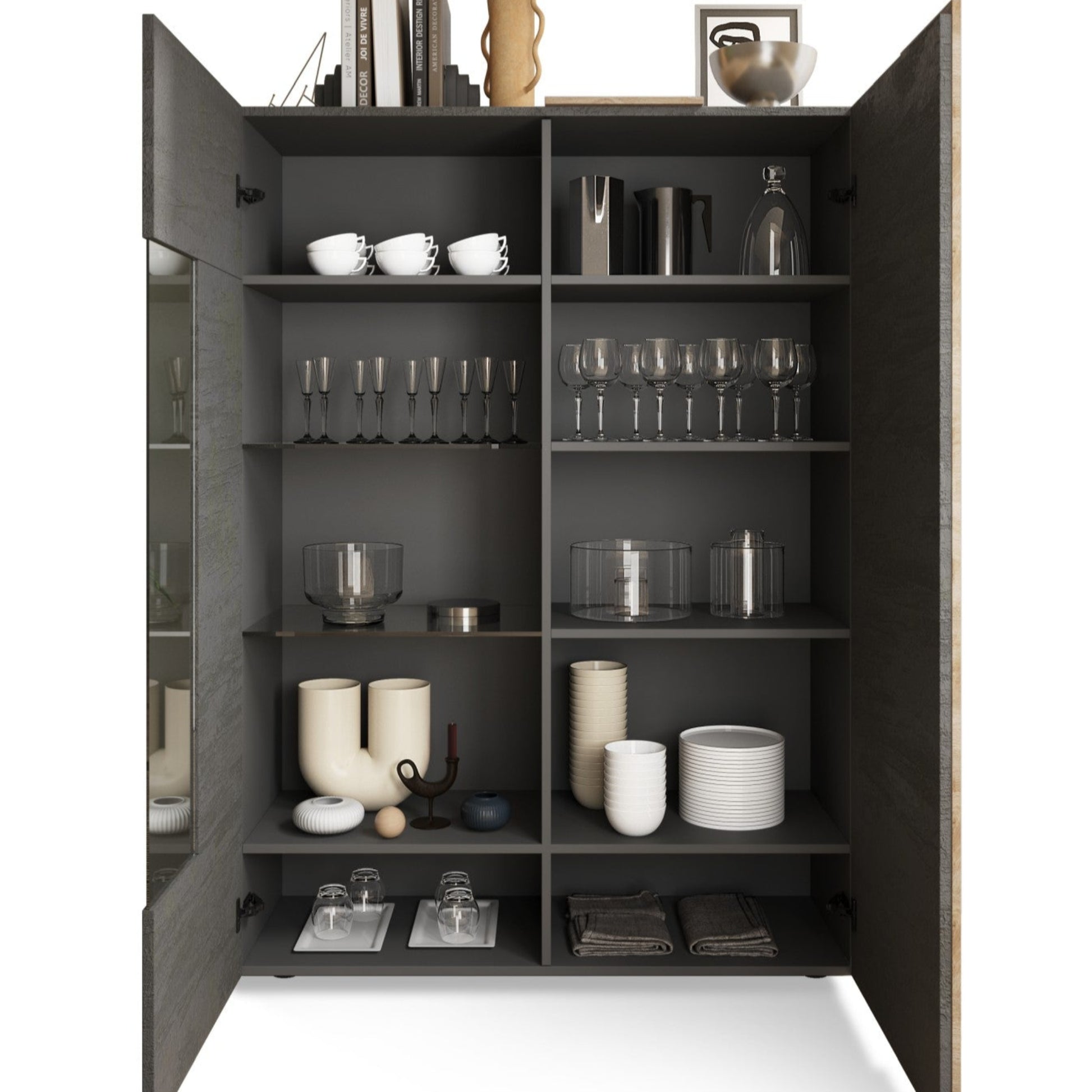 Inside, it offers six wooden shelves and two glass shelves ideal for showcasing your items elegantly. With ample storage, it helps maintain an organized space, while the light oak detail adds a refined touch. Each shelf can support up to 10kg, making it both attractive and practical.